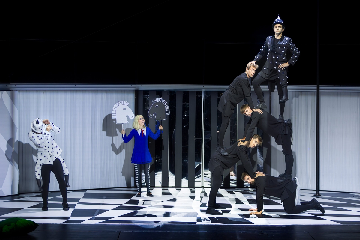 Rafinuotos formos spektaklis – meninė sėkmė, vizualiniai efektai jame itin dera su šiuolaikinio cirko elementais. Antrame veiksme jaudina kūrinio grožis, stebina išmonė. Tai teatro kaip paslapties ir stebuklo erdvės, kurioje, kaip ir Veidrodžio karalystėje, viskas kitaip nei gyvenime, teigimas. „Liūto ir Vienaragio kovos“ scenoje, kurioje veikia plokščios, tarsi iš popieriaus iškirptos lėlės, skylančios į dalis ir spindinčios tamsoje ryškiai oranžine ir mėlyna spalvomis, justi Gintaro Varno teatro pamokos, o finalinėje „Trijų valdovių puotoje“ – Roberto Wilsono estetikos įtaka. Vertintina, kad jauniesiems žiūrovams sukurtas estetiškai ištobulintas ir kokybiškas kūrinys.